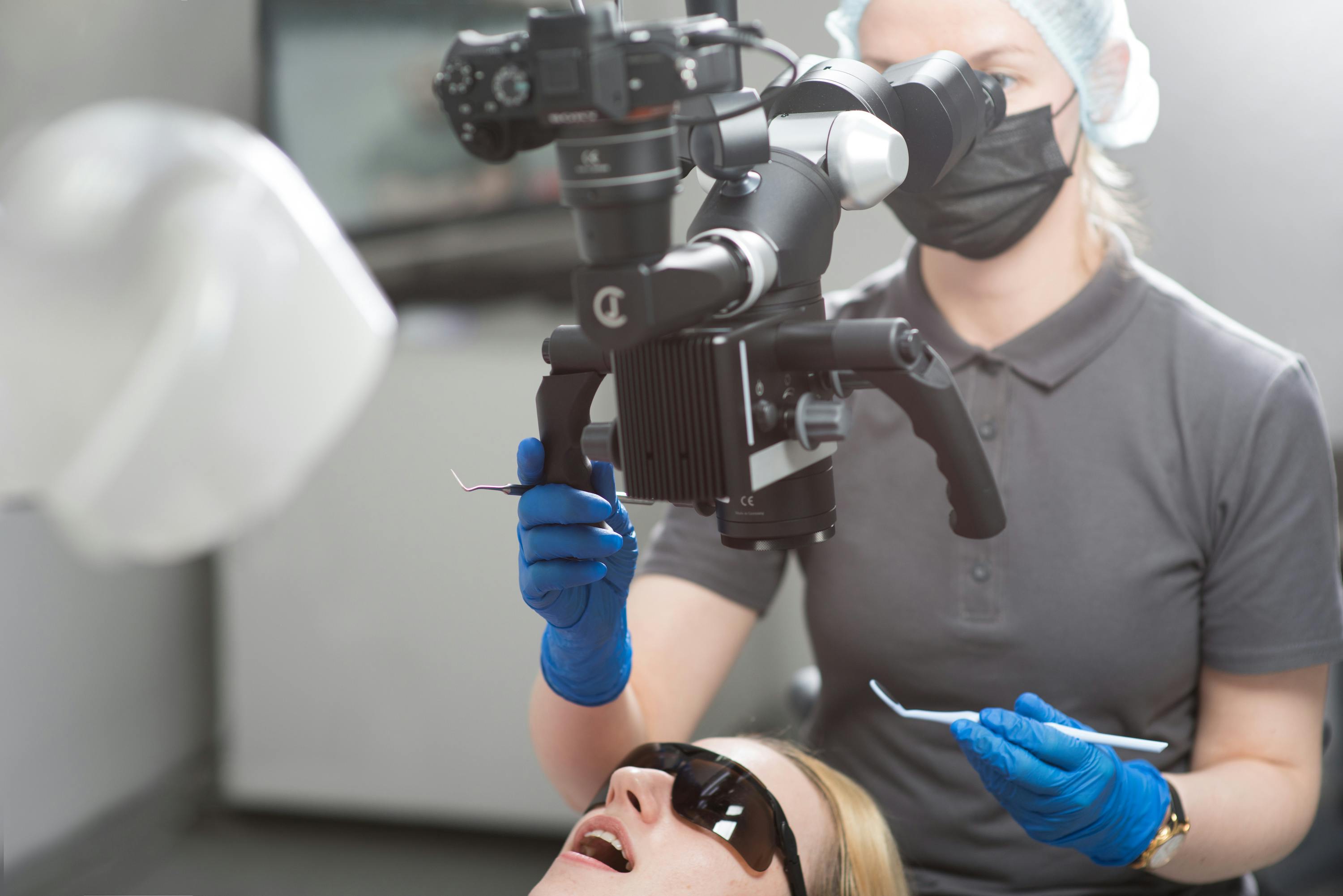 Стоматологический микроскоп — это прибор, позволяющий многократно увеличивать изображение и освещать рабочую область ярким светом. Использование оптики помогает врачу выявить даже те дефекты, которые невозможно заметить невооруженным глазом. Благодаря этому повышается точность диагностики и уменьшается риск повреждения здоровых тканей.